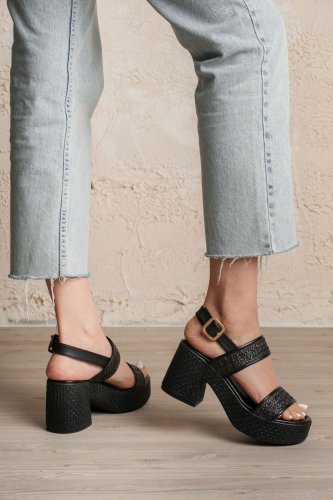 Wowi Siyah Cilt Baskılı Topuklu Sandalet